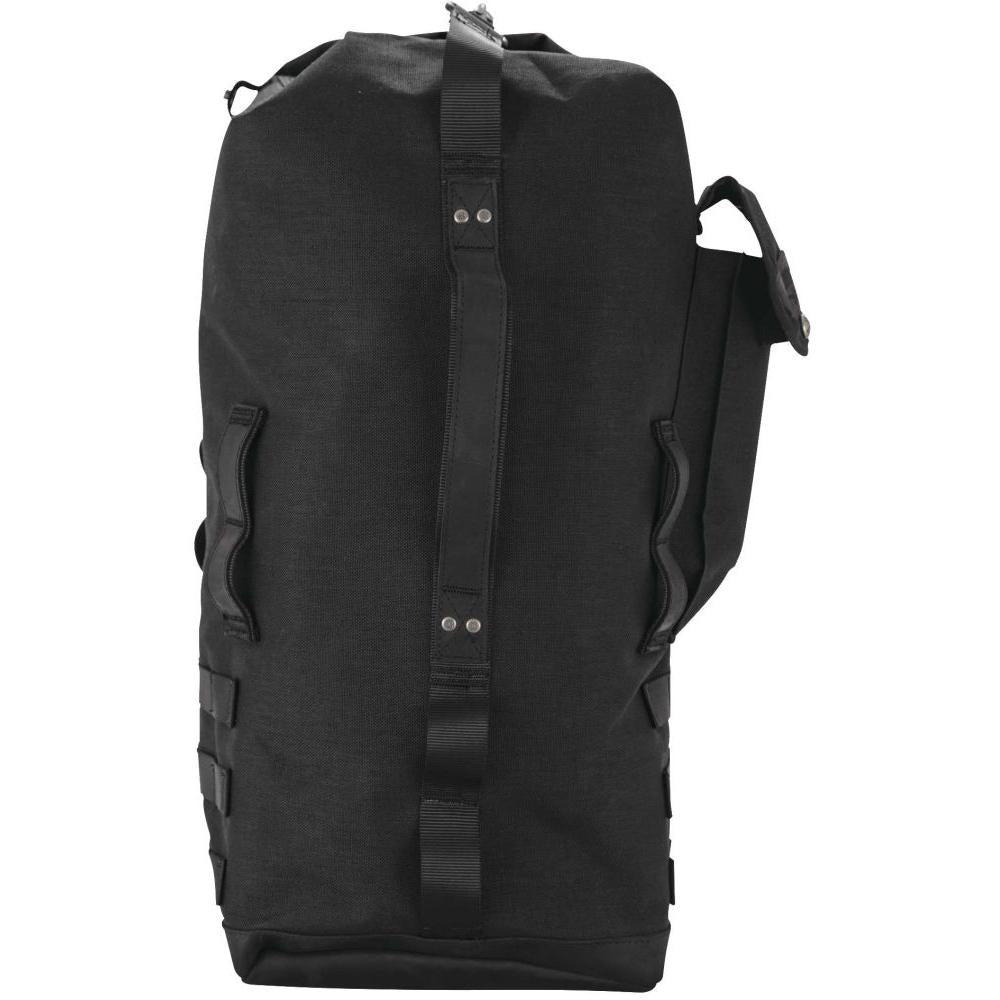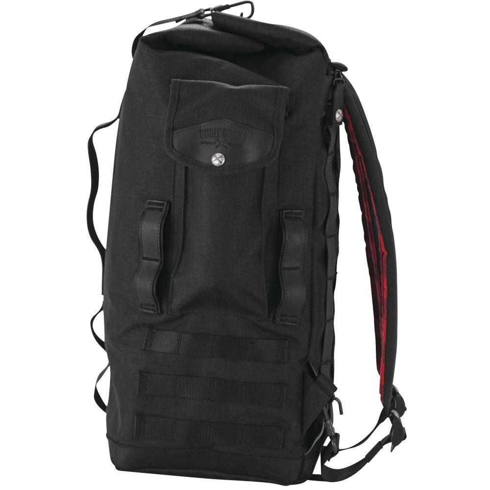 - Burly Brand Voyager Sissy Bar Backpack is made of our proprietary Dark Oak Wet Waxed UV-treated cotton canvas or Black CORDURA® and leather paneling for support that will age and show character over time. Three clever carry options with hidden backpack straps, a leather wrapped side grab handle for easy duffel bag mobility and two tie-down straps secure the MOLLE system to most Sissy Bars. High-quality "moto centric" zippers with metal Burly embossed button snaps and accents as well as an "Anti-Flail Snap System" keep everything secure.