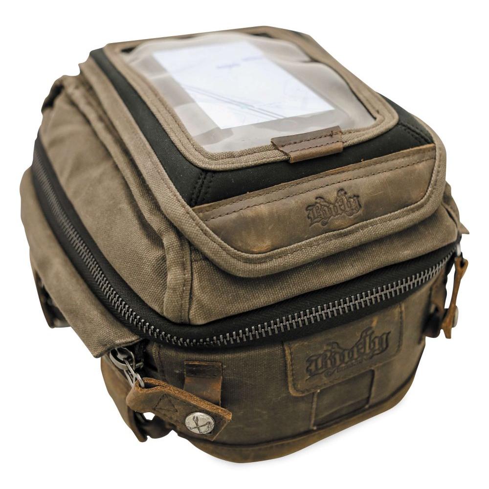 - The Burly Brand Voyager Tank/Tail Bag bares the elements with rugged 500gsm wet-waxed UV-treated cotton canvas construction or Black 1000-denier CORDURA® fabric and leather paneling/straps that will age and show character over time. It has an easy on, easy off magnetic system reinforced with safety securing D-ring anchor points for mounting. If you're riding solo or simply want the bag out of the way, it's equally at home on the tail and includes a tail mounting accessory flange that clips and cinches down on the back of your seat. It also includes a convenient magnetic removable map/accessory screen that sticks either directly to the bag lid or directly to the tank. The map screen is designed with an innovative stretch screen design to hold any variety of smart phones, small tablets, and even some GPS units. The bag features two exterior zipper pockets and a generous interior space with interior elastic sides. The bag also has a pass-thru port for motorcycle charging accessories so you can keep your smart phone, tablet or GoPro® powered up on a long ride. Park your bike and take the bag with you in seconds using the convenient carry handle; either directly off the tank, or via the four high-quality moto-centric speed buckles that are part of the bag's Anti-Flail Snap System on the tail.