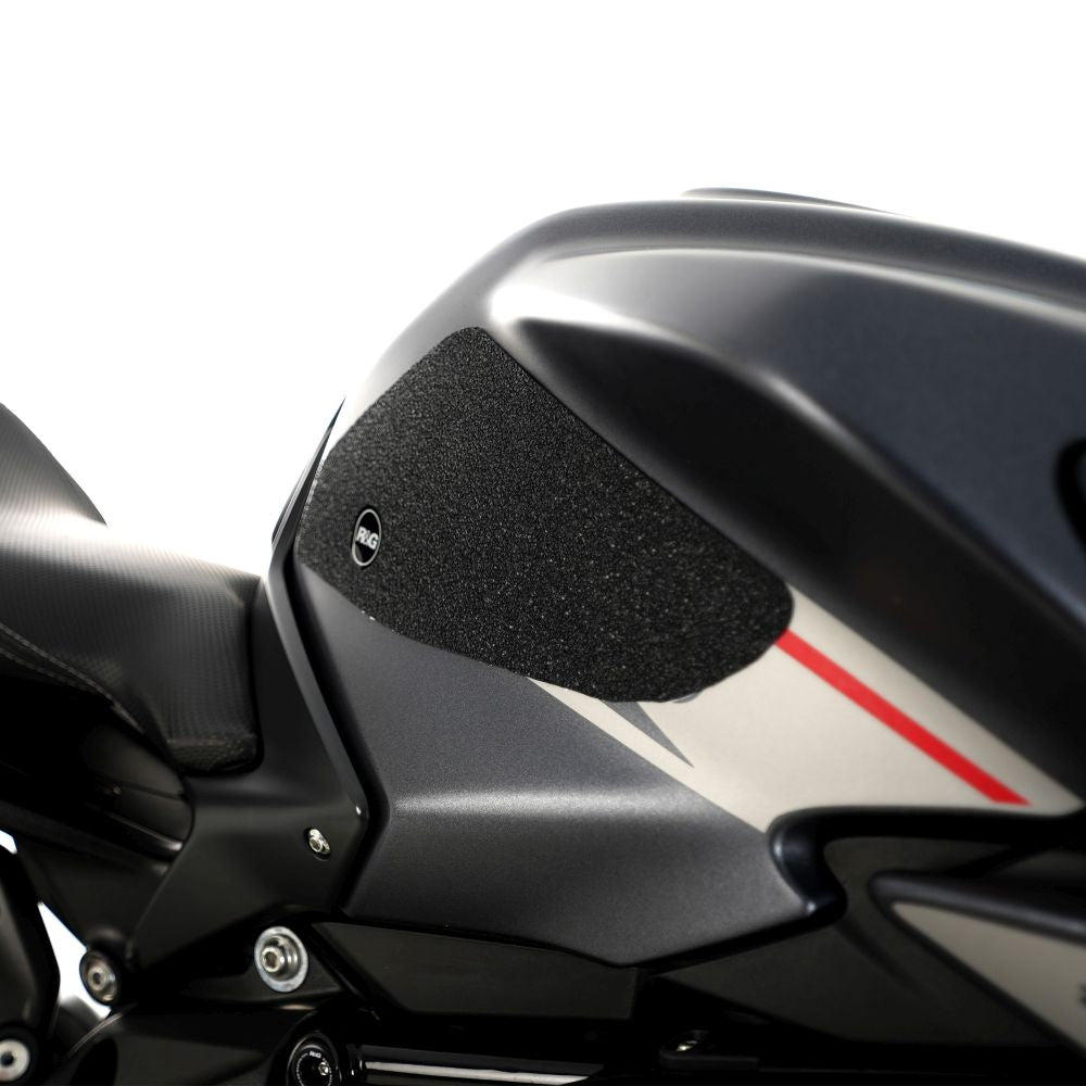 - Each R&G Tank Traction Grip kit is available in black and ultra-clear finishes to blend into your bike’s paintwork or stand out, depending on your preference.