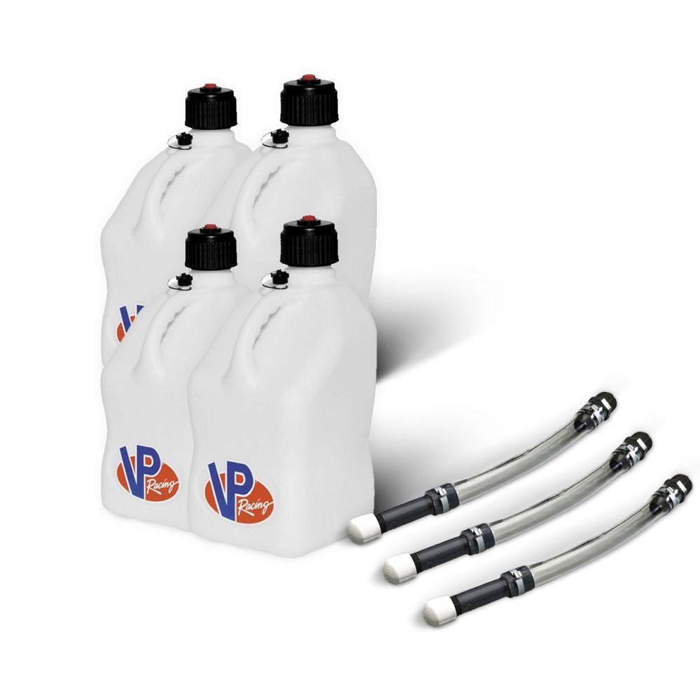 VP Racing 4 Pack White 5.5 Gallon Square Utility Jugs + 3 Deluxe Fill Hoses