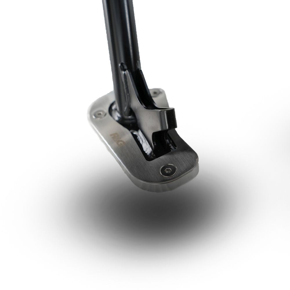 Never forget your sidestand puck again! Kickstand Shoes bolt onto the bottom of the sidestand, to enlarge the original’s footprint by up to 100%, significantly spreading the load placed upon it, to help prevent the stand ‘piercing’ the ground.