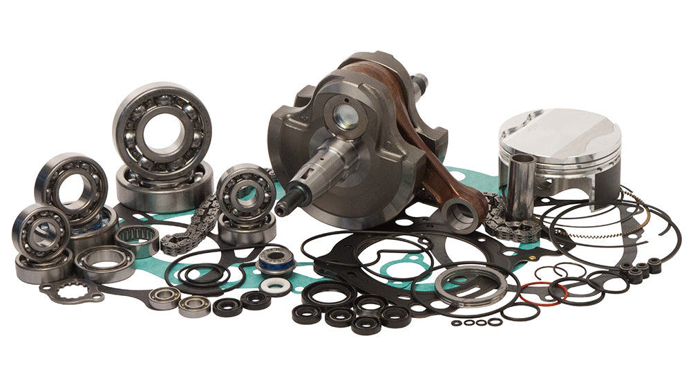 Includes: Crankshaft, piston kit, complete engine gasket kit with oil seals, main bearings and seals, water pump rebuild kit, transmission bearings, countershaft bushing/seal kit, wrist pin bearing, cam chain and counter balancer bearings when applicable