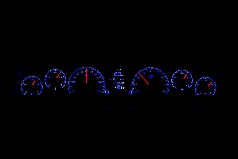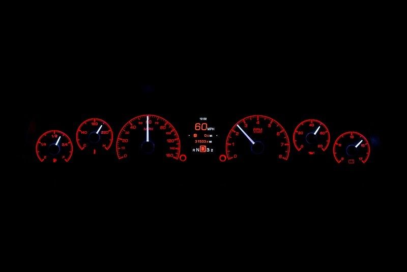 - Each analog gauge sweep contains a red LED indicator for quick notice of a warning condition (except speedometer)