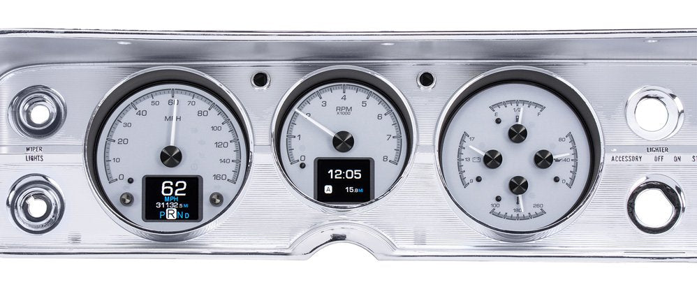 Ushering in a new era of muscle machines, the 1964-65 Chevy A bodies have long been turned into hot rods. Keep the tradition alive and bring yours up to spec with this direct-fit instrument system! It attaches directly to a stock or reproduction bezel (available separately) and supplies you with six analog gauge sweeps and a pair of high-visibility TFT message centers. Black or silver face styling is available.