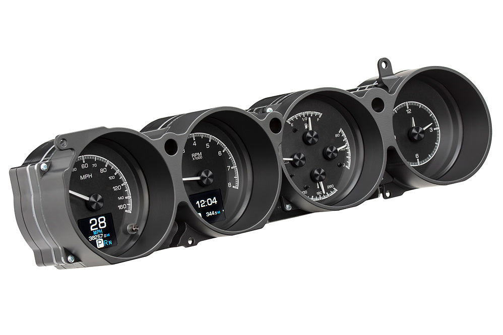 The HDX series From Dakota Digital is the latest in aftermarket automotive instrumentation technology. HDX takes personalization and usability to a whole new dimension while retaining your favorite features from the wildly popular VHX-series such as LED backlighting for the numbers, tick marks and dead-faced dash indicators (turn signals, high beam, check engine, cruise control engaged and parking brake). Illuminated needles and a lifetime warranty are still part of the deal as well. These features add up to a clean, easy to read instrument system in all conditions. Precision stepper motors provide accurate needle movement along with a full-sweep at key-on, and the needle hubs are black nickel plated spun-aluminum.