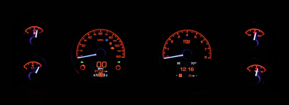 The HDX series From Dakota Digital is the latest in aftermarket automotive instrumentation technology. HDX takes personalization and usability to a whole new dimension while retaining your favorite features from the wildly popular VHX-series such as LED backlighting for the numbers, tick marks and dead-faced dash indicators (turn signals, high beam, check engine, cruise control engaged and parking brake). Illuminated needles and a lifetime warranty are still part of the deal as well. These features add up to a clean, easy to read instrument system in all conditions. Precision stepper motors provide accurate needle movement along with a full-sweep at key-on, and the needle hubs are black nickel plated spun-aluminum.