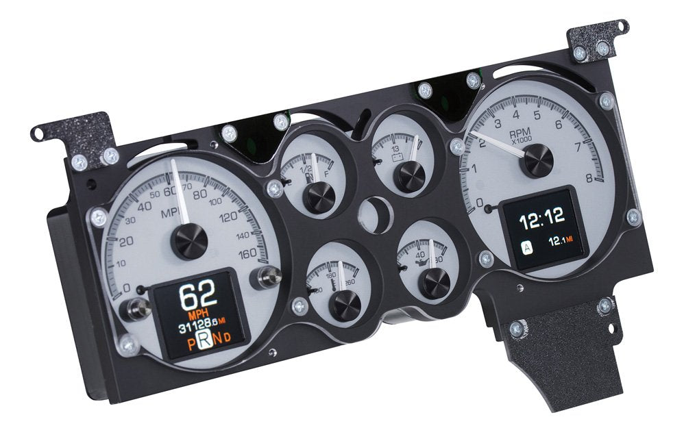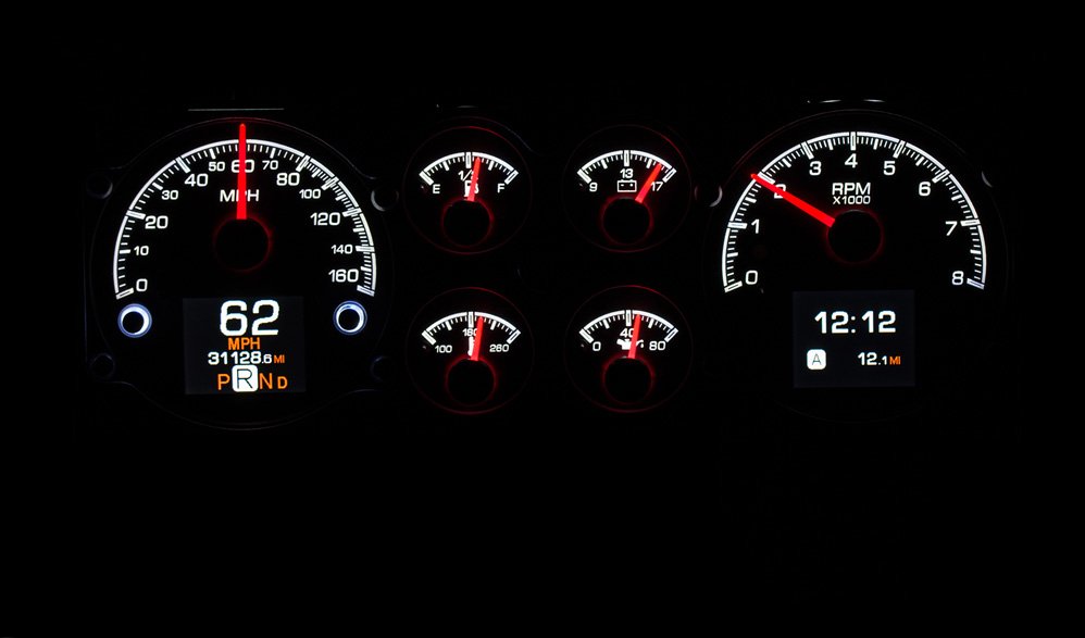The HDX series From Dakota Digital is the latest in aftermarket automotive instrumentation technology. HDX takes personalization and usability to a whole new dimension while retaining your favorite features from the wildly popular VHX-series such as LED backlighting for the numbers, tick marks and dead-faced dash indicators (turn signals, high beam, check engine, cruise control engaged and parking brake). Illuminated needles and a lifetime warranty are still part of the deal as well. These features add up to a clean, easy to read instrument system in all conditions. Precision stepper motors provide accurate needle movement along with a full-sweep at key-on, and the needle hubs are black nickel plated spun-aluminum.