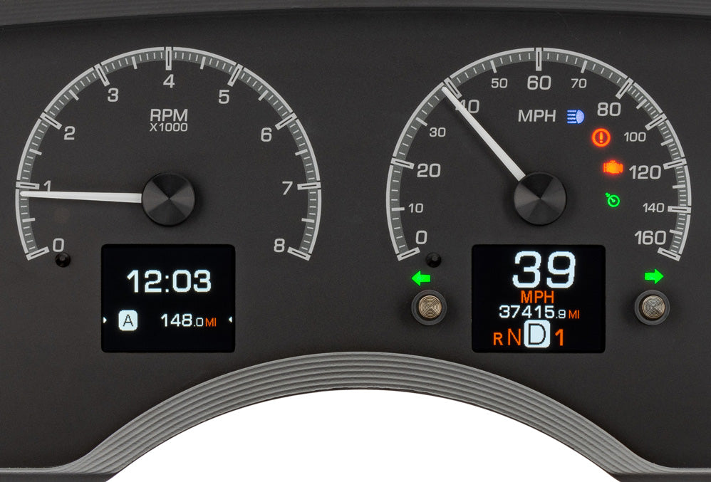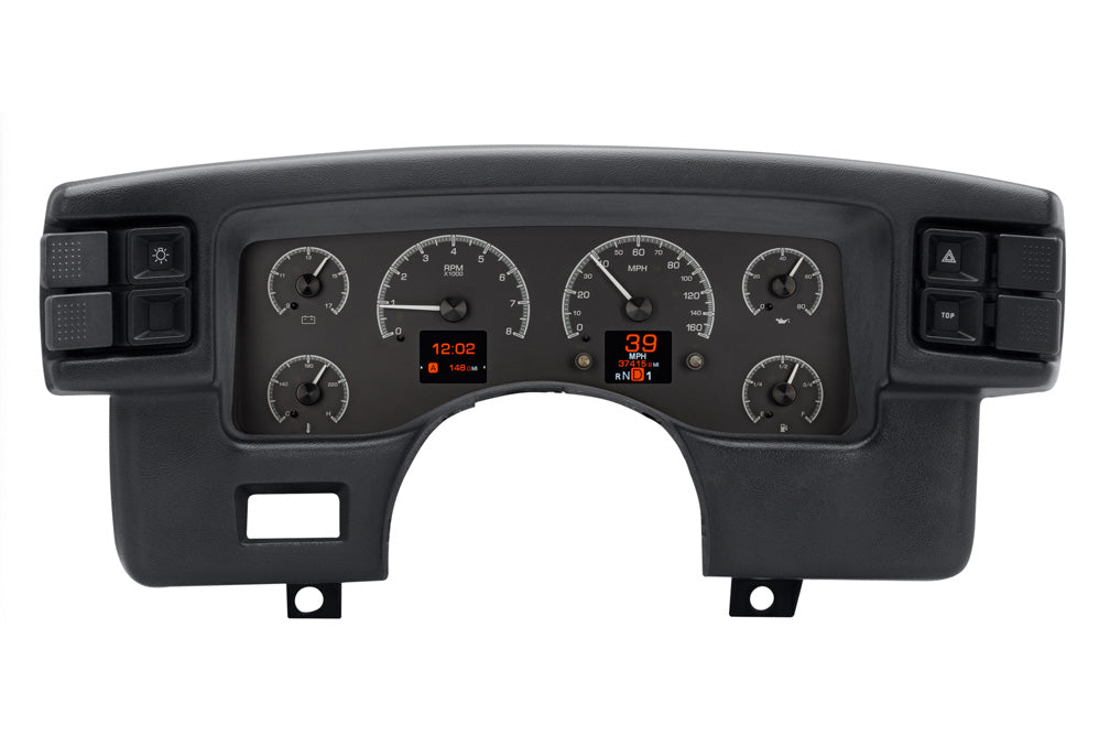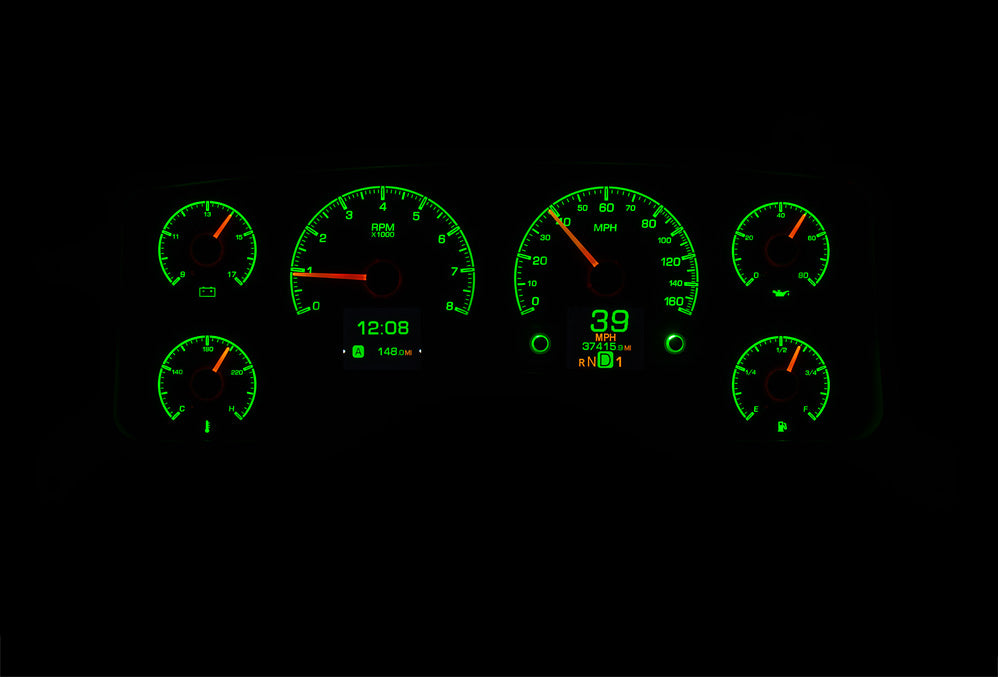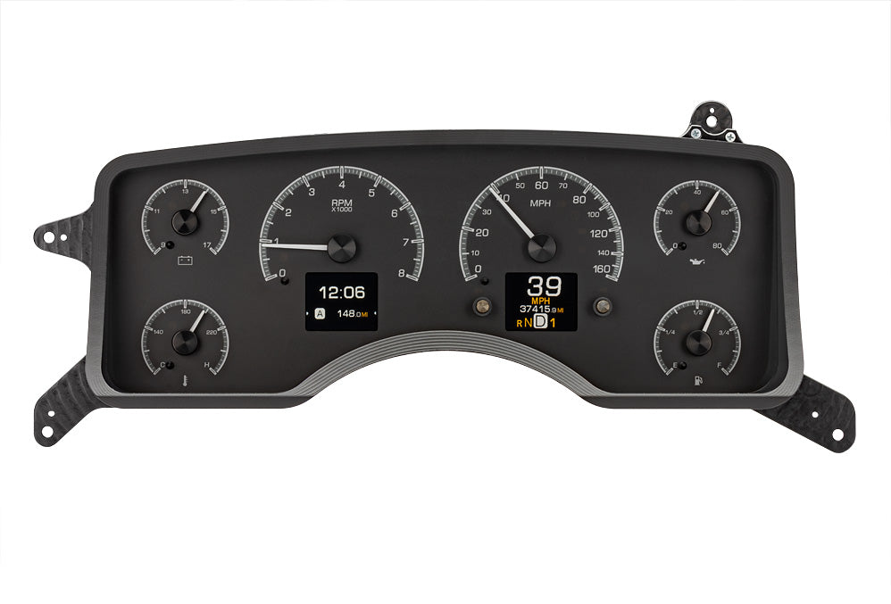 The HDX series From Dakota Digital is the latest in aftermarket automotive instrumentation technology. HDX takes personalization and usability to a whole new dimension while retaining your favorite features from the wildly popular VHX-series such as LED backlighting for the numbers, tick marks and dead-faced dash indicators (turn signals, high beam, check engine, cruise control engaged and parking brake). Illuminated needles and a lifetime warranty are still part of the deal as well. These features add up to a clean, easy to read instrument system in all conditions. Precision stepper motors provide accurate needle movement along with a full-sweep at key-on, and the needle hubs are black nickel plated spun-aluminum.