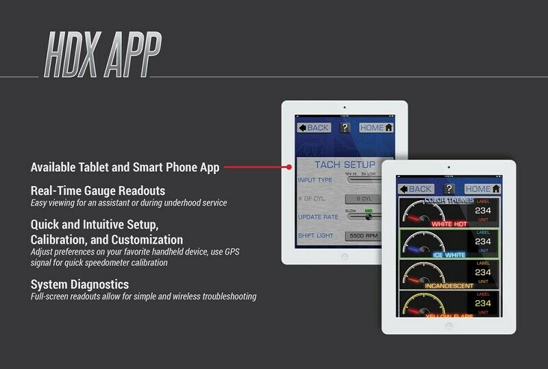 All HDX Series Instrument Systems include LED-lit onboard capacitive touch pushbuttons through the gauge face. These pushbuttons provide quick and consistent access to all functions, either in driving mode or while in the setup menu. Button-press feedback is available through the TFT Message Center, or through the included buzzer. Additionally, remote mounted switches can be wired into the HDX system if this proves more accessible based upon seating position. The HDX Series can also be completely configured through the Bluetooth app, suitable to Android and Apple devices. Using your existing tablet or smart phone, download the free app, sync your device to the HDX system, and enjoy quick and convenient menu navigation and real time gauge readouts for diagnostic use or a secondary display.