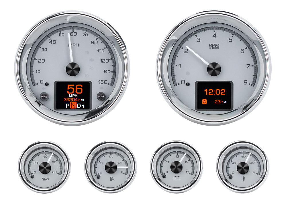 Check out this universal six gauge package. The billet aluminum housings have been chrome plated after being sized to fit common aftermarket openings measuring 4 5/8” and 2 1/16” in diameter. Upgrading your existing dash panel has never been easier, or more attractive! 30 backlighting colors, TFT displays and the fool-proof control box you’ve come to expect from Dakota Digital make this an easy decision! Instruments drop in from front of dash; front bezel O.D. measures 5” for speed and tach and 2 5/16” for the satellites; all require approximately 2 ¼” depth.