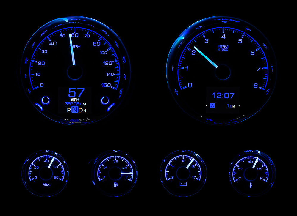 The HDX series From Dakota Digital is the latest in aftermarket automotive instrumentation technology. HDX takes personalization and usability to a whole new dimension while retaining your favorite features from the wildly popular VHX-series such as LED backlighting for the numbers, tick marks and dead-faced dash indicators (turn signals, high beam, check engine, cruise control engaged and parking brake). Illuminated needles and a lifetime warranty are still part of the deal as well. These features add up to a clean, easy to read instrument system in all conditions. Precision stepper motors provide accurate needle movement along with a full-sweep at key-on, and the needle hubs are black nickel plated spun-aluminum.