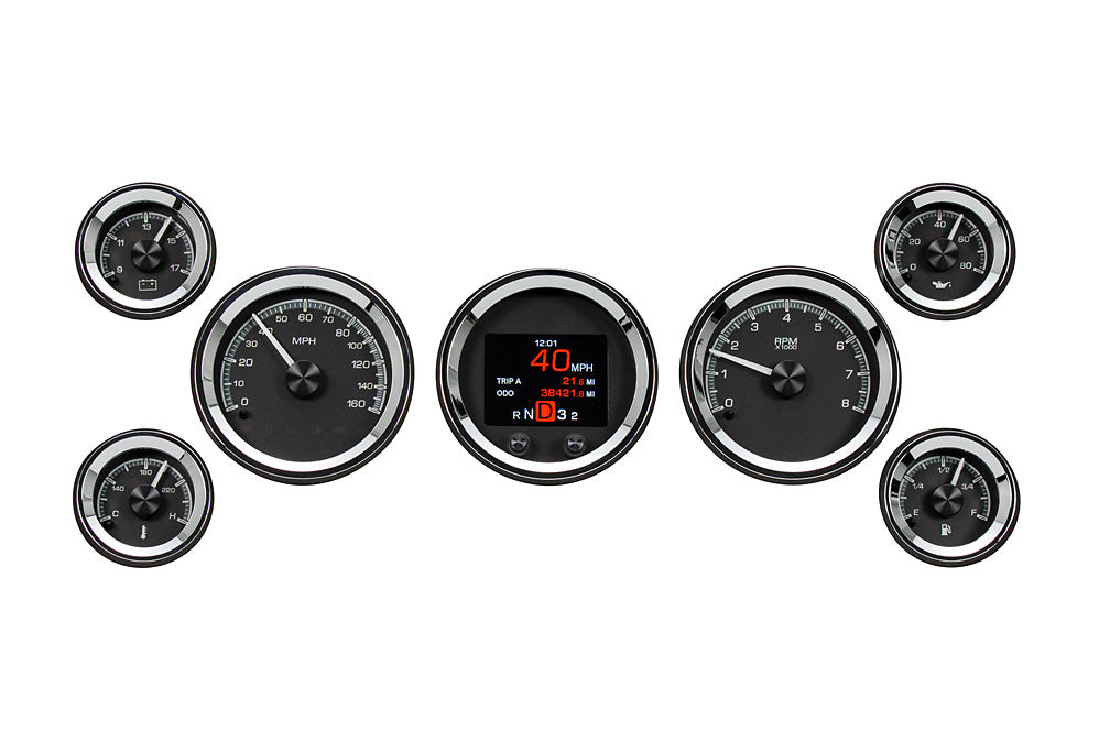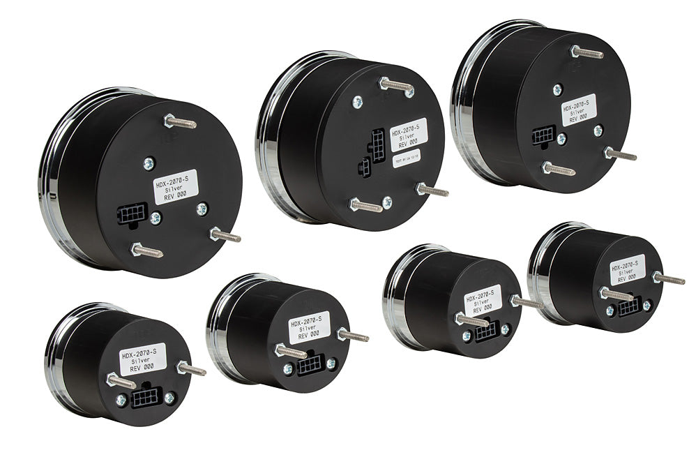 HDX technology in a timeless arrangement! Whether you have an existing panel that needs to be updated, or you’re scratch building your dream, this six-gauge set offers the utmost in flexibility! The speedometer/tach and TFT message center each drop into 3 3/8” holes, while their matching satellites spec out at 2 1/16”; the HDX-2070 requires 2” of depth behind your panel. Machined mounting cups secure the gauges to your panel, attached with supplied thumb nuts. That full-color TFT message center can display as much information as you like!