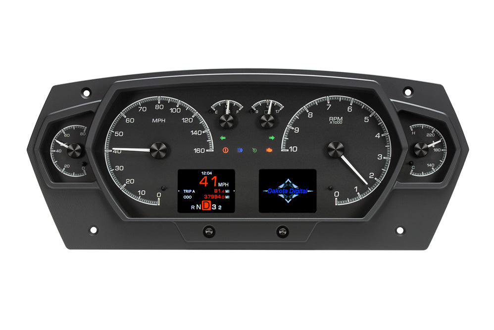 The HDX series From Dakota Digital is the latest in aftermarket automotive instrumentation technology. HDX takes personalization and usability to a whole new dimension while retaining your favorite features from the wildly popular VHX-series such as LED backlighting for the numbers, tick marks and dead-faced dash indicators (turn signals, high beam, check engine, cruise control engaged and parking brake). Illuminated needles and a lifetime warranty are still part of the deal as well. These features add up to a clean, easy to read instrument system in all conditions. Precision stepper motors provide accurate needle movement along with a full-sweep at key-on, and the needle hubs are black nickel plated spun-aluminum.