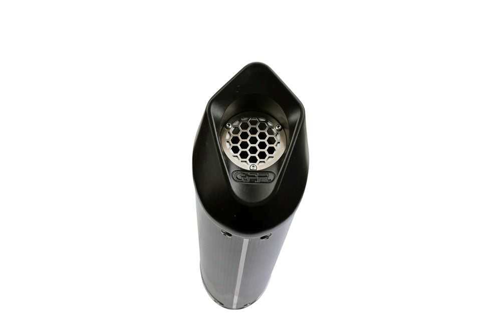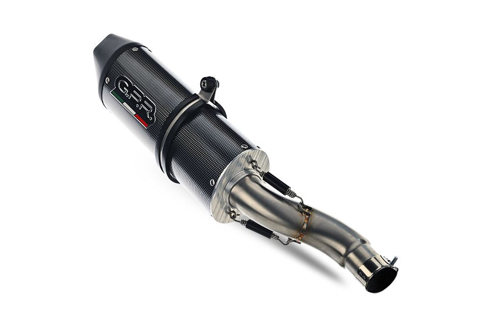 This kit includes the specific link pipe or half-manifold with specific appropriate brackets and accessories. This allows for installation without any structural modifications.GPR's Furore Poppy silencer has a carbon look, stainless body and has been developed with a production process that produces zero impact to the environment. It has an oval shape with a diameter of 4.7 inches (120MM), with avional bottoms produced by CNC machining.