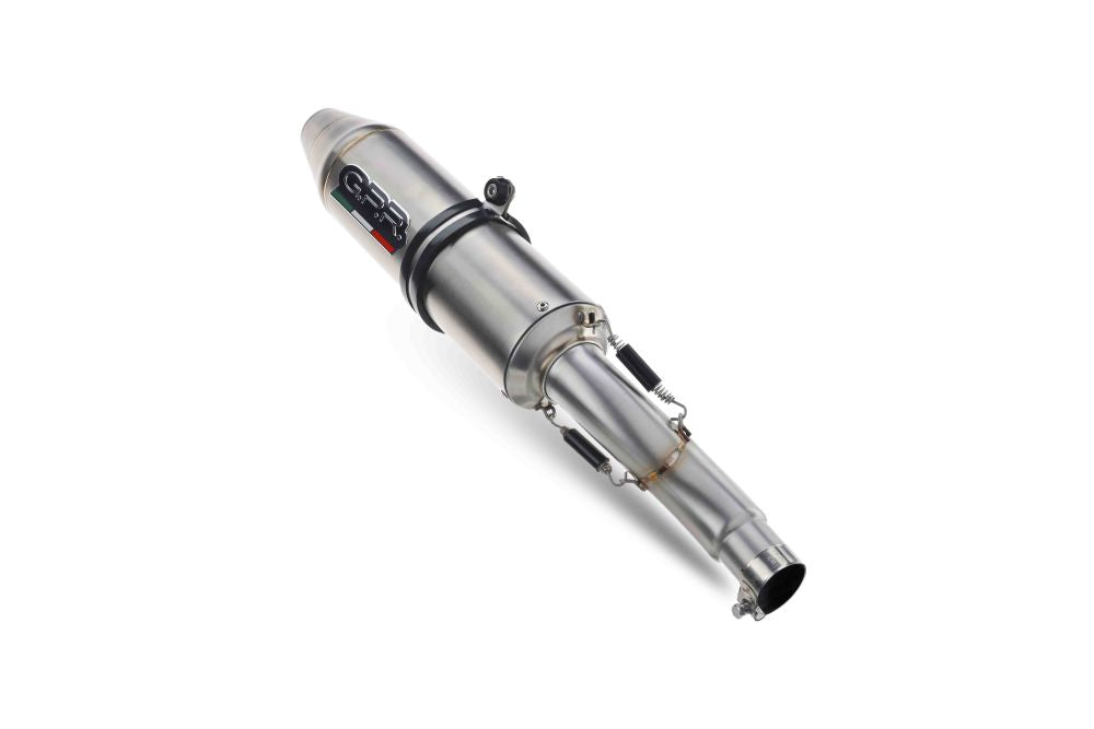 This kit includes the specific link pipe or half-manifold with specific appropriate brackets and accessories. This allows for installation without any structural modifications.GPR's Satinox silencer is made of 304 stainless steel. It has an oval shape with a diameter of 3.5 inches x 4.7 inches (90MM x 120MM).