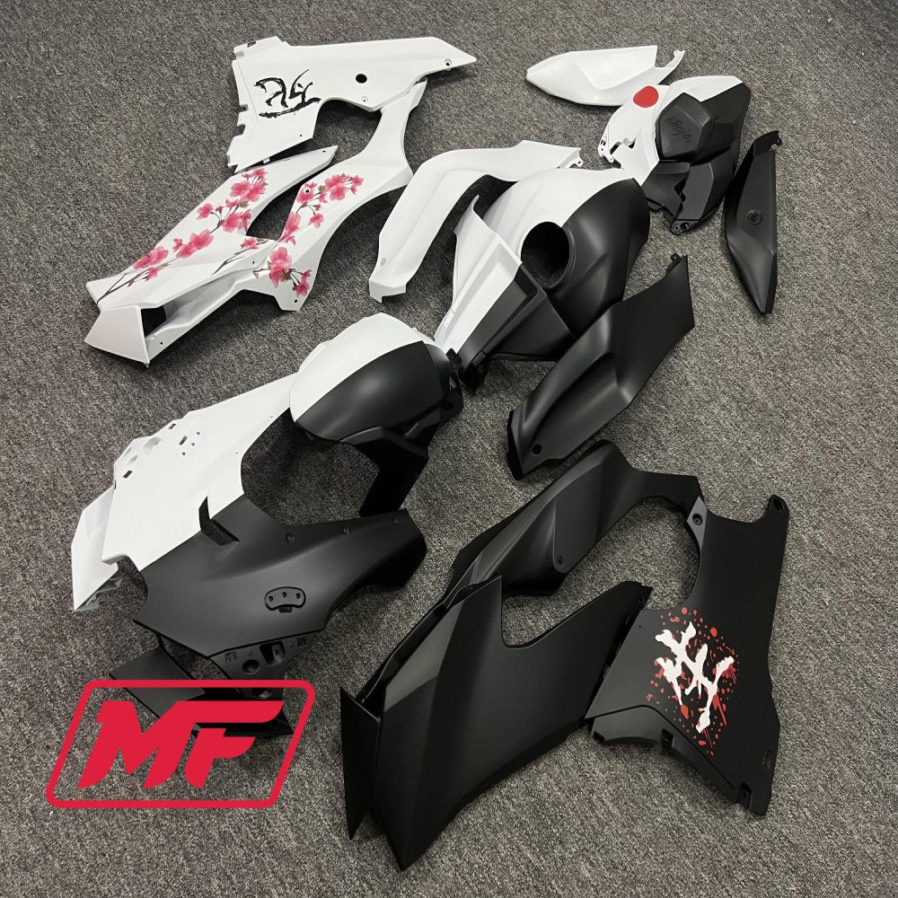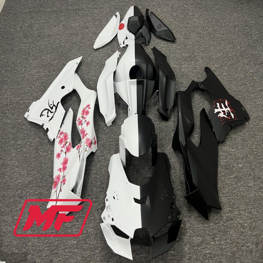 Monster Fairings Full Kit Kawasaki ZX-10R 21-25 Black And White Split Cherry Blossom + Windshield + Gas Tank Cover