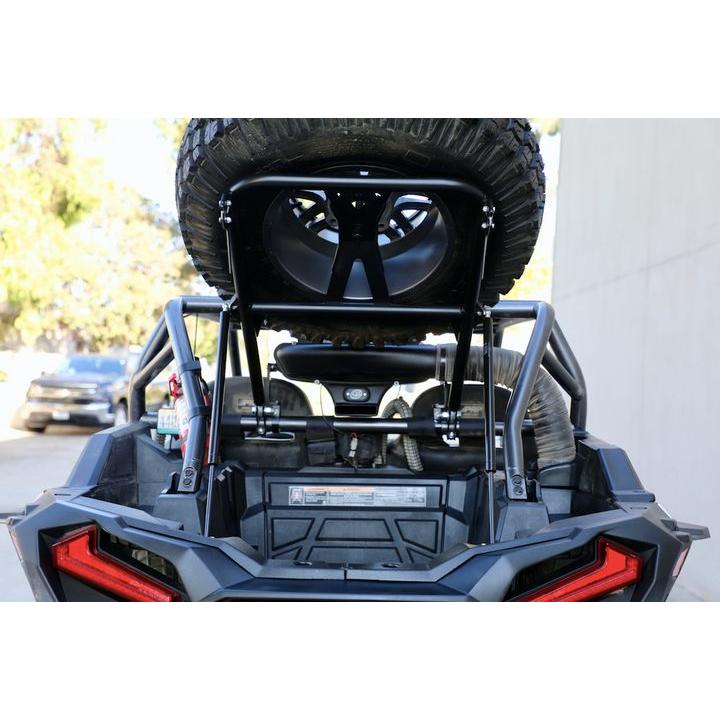 The carrier can be bolted or welded onto the seat belt tube. High quality steel and aluminum hardware is included, allowing for an easy and seamless install. The carrier latches securely thanks to a unique latch design, reducing any unwanted noises or rattles. Gas shocks are included so you can effortlessly lift the rack up even when a tire is installed. Carrier will hold up to a 32-inch tire with no modification.