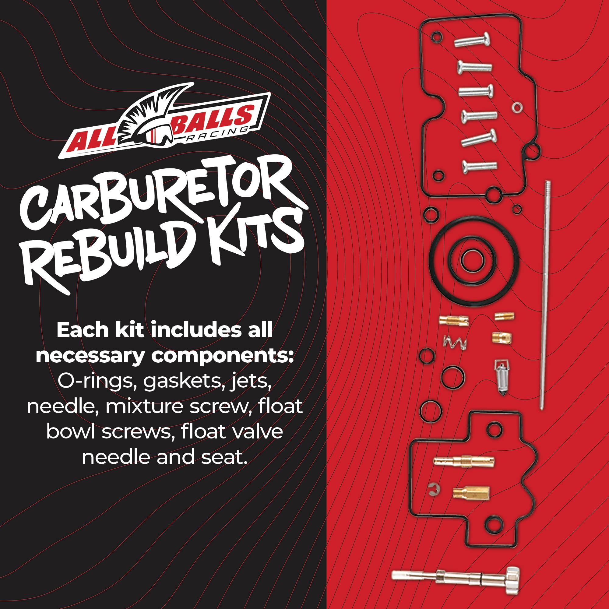 All Balls Carburetor Rebuild Kits replace worn seals and gaskets, to restore proper fuel metering. Model-specific components match OEM sizing for a direct, leak-resistant service.