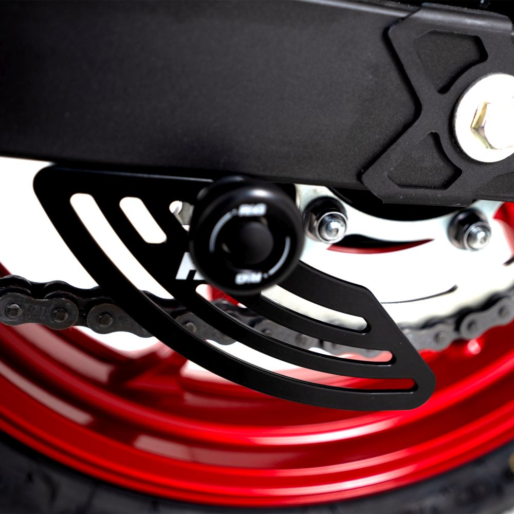 R&G Racing's new, road-racing-inspired toe guard. Made from aluminium for a lightweight and strong product it features pre-drilled holes attaching to the existing mounts on the swingarm, ensuring effective coverage of the sprocket.
