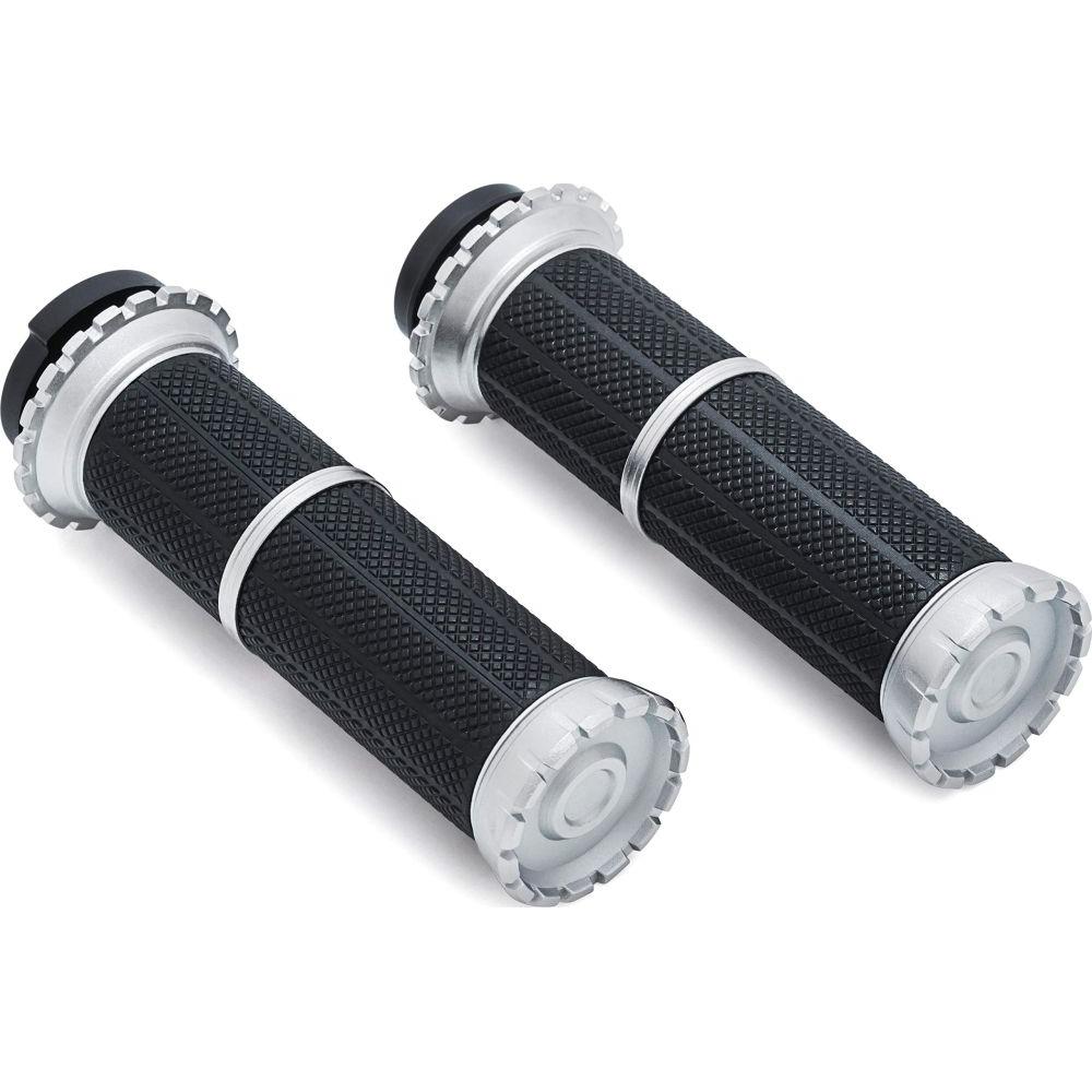 - Color:Silver | Style:Electronic ThrottleThe Kuryakyn 3581 Riot Grips for Electronic Throttle in Bead-Blasted Silver are a glue-less clutch grip, making installation and removal for handlebar swaps easy. Features premium EPDM (Ethylene Propylene Diene Monomer) rubber compound that eliminates vibration. Designed with a thin profile; soft and durable EPDM rubber provide control and comfort. Cast aluminum trim rings in bead-blasted silver add that custom touch. Includes (1) Clutch Side Grip, (1) Throttle Side Grip for Electronic Throttle; suggested for installation (not Included): set of torx wrenches, set of hex wrenches, combination wrenches, utility knife, 80-100 grit sandpaper and adhesive solvent. The Kuryakyn 3580 Riot Grips for Electronic Throttle in Bead-Blasted Silver are compatible with Harley-Davidson models: '08-'19 with Electronic Throttle Control (excludes '18-'19 FLTRXSE).