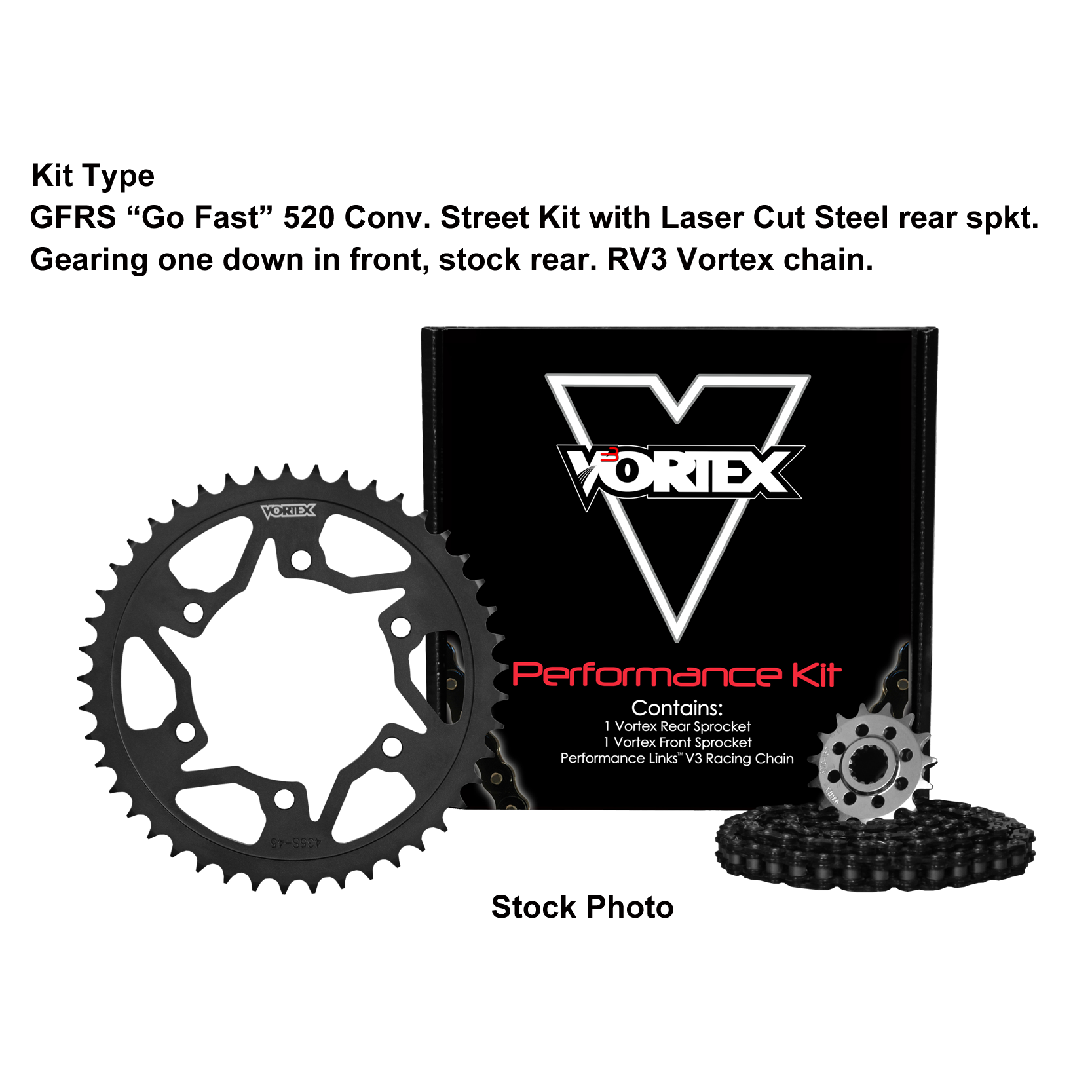 GFRS "GoFast" 520 Conversion Street kit with laser cut steel rear sprocket. Gearing one down in front, stock rear. RX3 Vortex Chain.