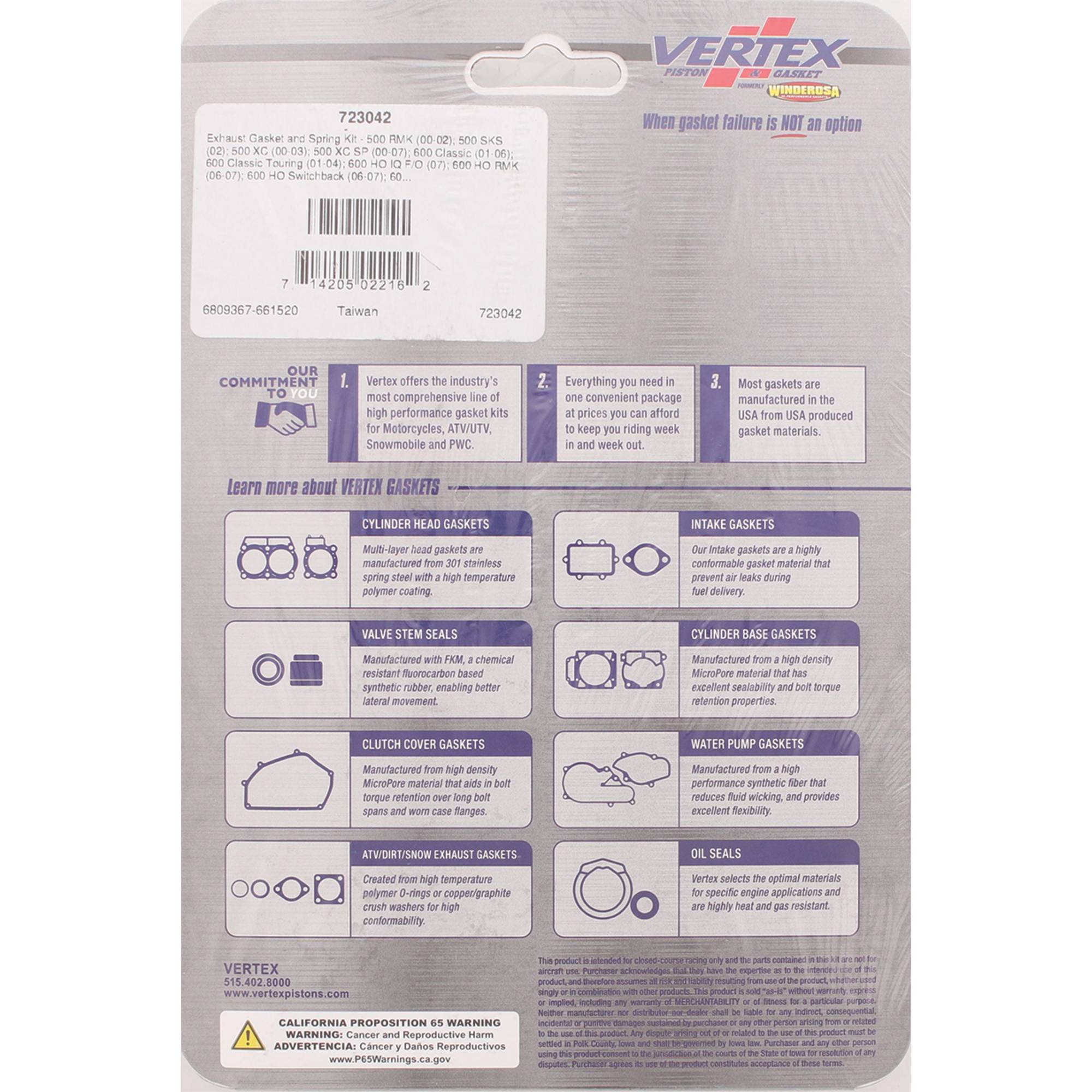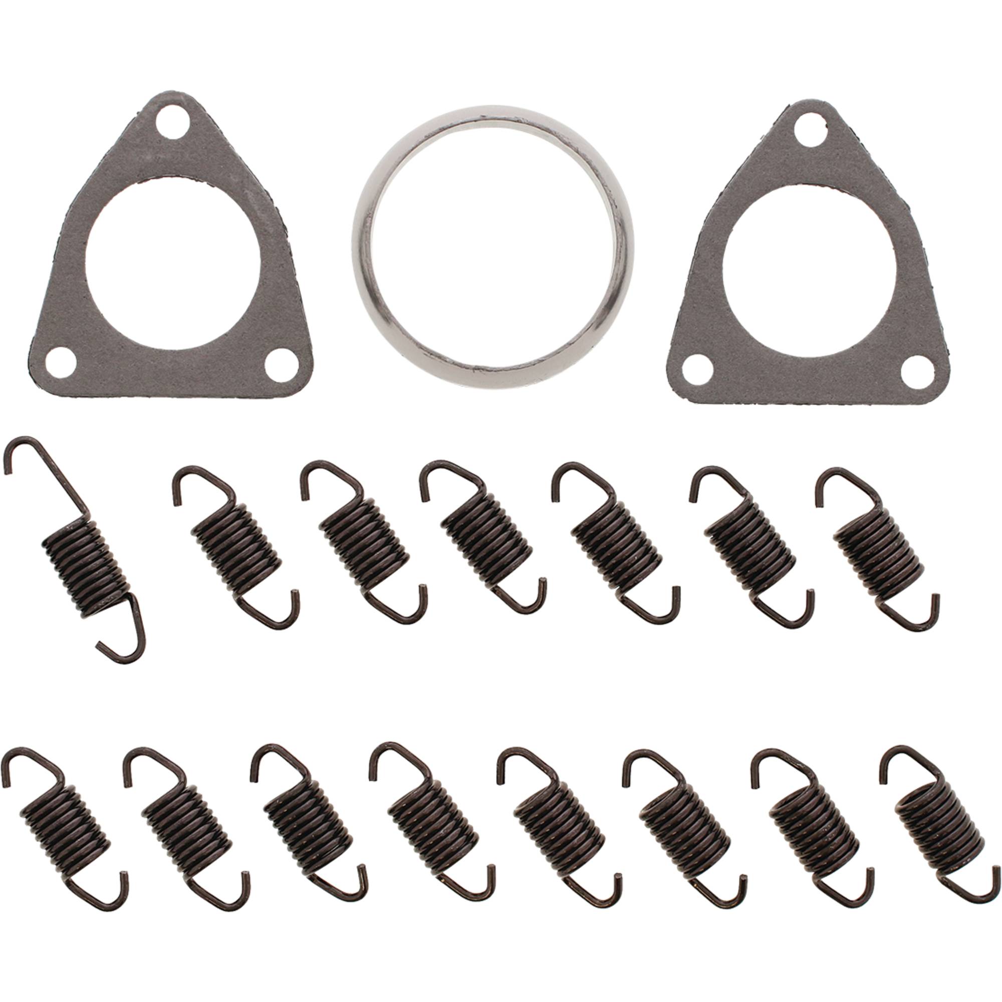 The Vertex Exhaust Gasket Kit replaces worn exhaust gaskets to stop leaks at the head pipe, mid-pipe, or muffler joint. Components are model-specific and match OEM dimensions for a direct, heat-resistant seal.