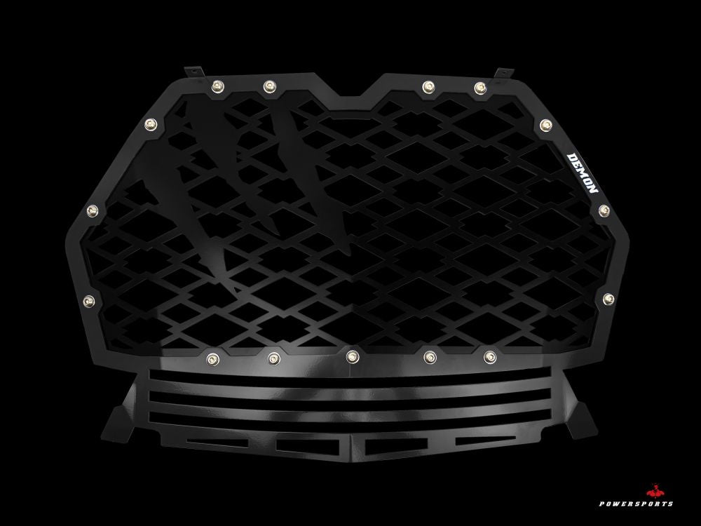 The Demon Powersports Front Grill from provides your machine with an aggressive and stylish look that will absolutely turn heads. While keeping your machine looking unique the grill does not affect any performance allowing proper airflow to cooling and charge air systemsIt replaces the factory plastic grill and easily mounts using a few screws. The Grill is not compatible with machines that have a front bumper.