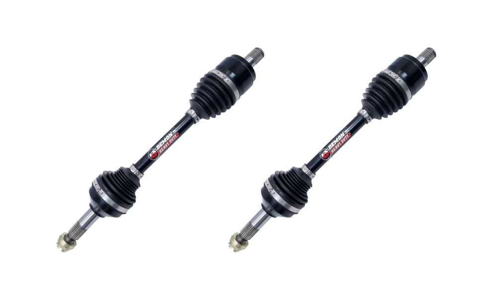 Through years of research and development Demon Powersports has developed an axle that doesn?t burn a hole in your pocket and adheres to the highest quality standards. These axles are bigger, beefier, and stronger. Demon Heavy Duty Axles are built using larger CV joints and shafts, paired with our proprietary dual heat treatment process, and 4340 Chromoly Steel inner CV cage gives these the axles the edge it needs for superior strength and longevity. These axles also utilize a unique double plunge design which allows it to achieve higher articulation angles approximately, the axles are designed to slide on the bar splines allowing for 1.5 inches of travel and 40? articulation over terrain on the inboard joint. The outboard joint can travel 0.5inches and swing from 45?-47? depending on the model. The Demon heavy duty axles are equipped The TPEE (Thermoplastic polyester elastomer) boots which are stronger, stiffer, more fatigue resistant, puncture resistant, and more temperature resistant than a standard OEM boot. Axles use molybdenum grease to provide low friction and smooth motion.Trust in Demon Heavy Duty Axles to keep you riding!!