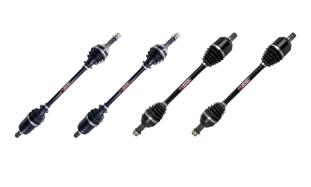 Through years of research and development Demon Powersports has developed an axle that doesn?t burn a hole in your pocket and adheres to the highest quality standards. These axles are bigger, beefier, and stronger. Demon Heavy Duty Axles are built using larger CV joints and shafts, paired with our proprietary dual heat treatment process, and 4340 Chromoly Steel inner CV cage gives these the axles the edge it needs for superior strength and longevity. These axles also utilize a unique double plunge design which allows it to achieve higher articulation angles approximately, the axles are designed to slide on the bar splines allowing for 1.5 inches of travel and 40? articulation over terrain on the inboard joint. The outboard joint can travel 0.5inches and swing from 45?-47? depending on the model. The Demon heavy duty axles are equipped The TPEE (Thermoplastic polyester elastomer) boots which are stronger, stiffer, more fatigue resistant, puncture resistant, and more temperature resistant than a standard OEM boot. Axles use molybdenum grease to provide low friction and smooth motion.Trust in Demon Heavy Duty Axles to keep you riding!!