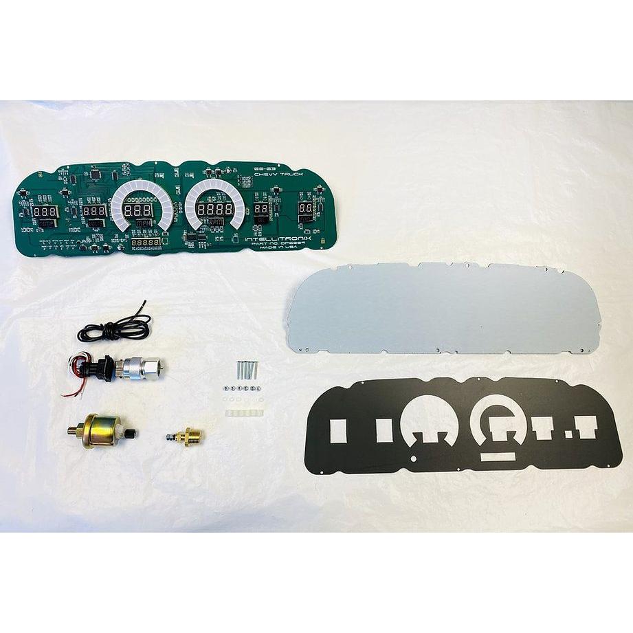 The 1960-63 Chevy Truck has the look and feel of elegance and will make you the envy of all Chevy truck lovers with your new 60-63 Chevy Truck LED Digital Replacement Gauge Panel by Intellitronix. Complete with direct fit printed circuit boards, custom fit smoked plexiglass faceplate, universal temperature, oil pressure, and speedometer sending units with sender and sensor for vehicles without electronic transmission or cruise control, and instructions for installation.Brand: Intellitronix
