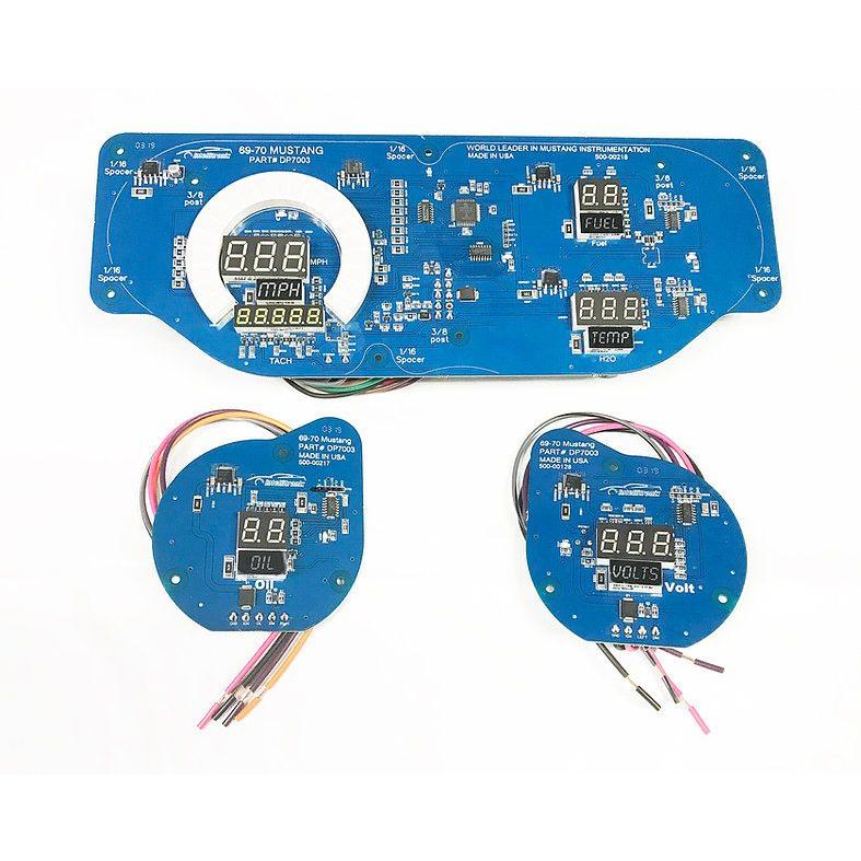Calling all 1969-1970 Ford Mustang owners, check out the new 1969-1970 Ford Mustang LED Digital Direct Fit Replacement Gauge Panel from Intellitronix. The 69-70 Ford Mustang LED Digital Gauge Panel features a Speedometer and Tachometer combination along with 4 other gauges. The replacement panel comes complete with direct fit printed circuit boards, custom fit smoked plexiglass faceplate, universal temperature, oil pressure, and speedometer sending units with senders and sensors for vehicles without electronic transmission or cruise control, and instructions for installation.Brand: Intellitronix
