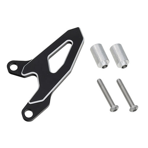 PSYCHIC SPROCKET GUARDS. CONSTRUCTED FROM CNC MACHINED HIGH QUALITY ALUMINIUM. COLOUR ANODIZED WITH SILVER CUT-OUT AT 2-TONE SURFACE FINISH. DESIGNED TO KEEP MUD OUT OF THE FRONT SPROCKET AREA.