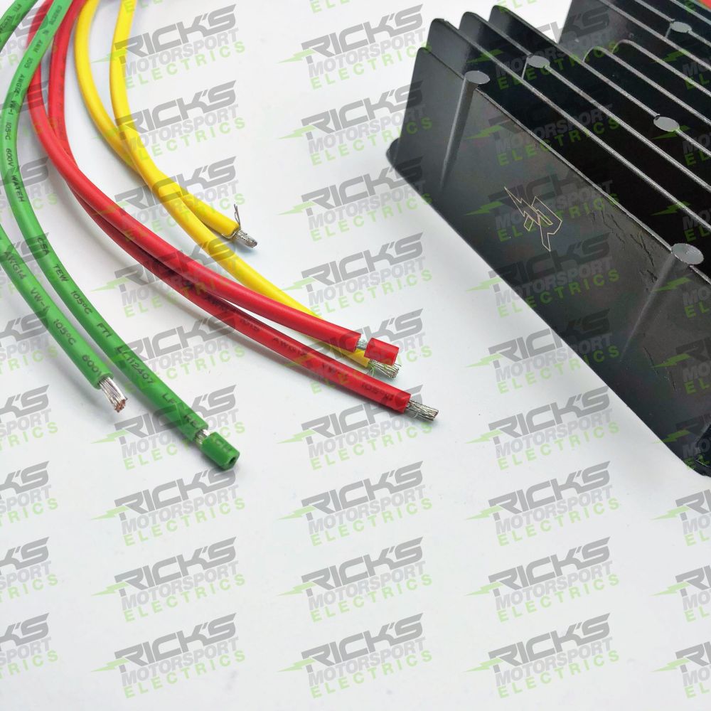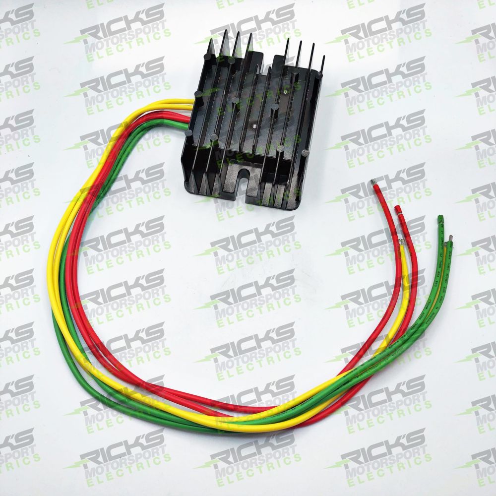 Universal Hot Shot Rectifier-Regulator Lithium Compatible Single Phase; this aftermarket rec/reg is designed as a UNIVERSAL piece - that means it will come with WIRE LEADS ONLY. Some harness fabrication will be needed. You will need to connect (via soldering) your OE plug to the regulator harness. Installation instructions will be included. This is a 50 amp unit made with Mosfet technology and designed for single phase systems with the correct voltage set point for lithium batteries. Part measurements are: center to center bolt holes min = 74mm; max = 110mm; body dimensions are: 110mm x 80mm x 33mm thick. Lead wires are 18" long.*This will work electrically for single phase systems BUT you will NEED TO MAKE THIS WORK ON YOUR MACHINE with modification & soldering.**This rec-reg is not for use with standard lead acid batteries. The voltage set point is 14V +/- .2. Please contact the manufacturer of your Lithium Ion Battery to ensure our product has the correct set point for their product. ***Rick's Motorsport Electrics One Year Product Warranty is for the Rec-Reg only. Rick's warranty does not cover batteries of any type.