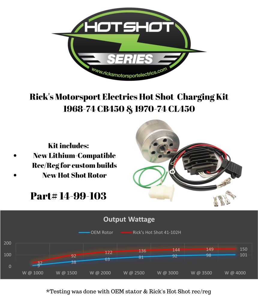 New Honda Charging Kit: This Hot Shot charging kit includes both a new HO rotor and a lithium friendly combination rectifier-regulator for 1968-74 CB450K and 1970-74 CL450. This kit is designed for custom builds as the rec/reg won't look the same as OE and will need to be relocated. The kit will put out approximately 150 watts: 50% over OE. You do NOT need to replace your OE stator unless it tests bad, this kit works with the OE stator. *Lead acid battery users: please see our part# 99-103 or 99-111 designed specifically for use with traditional lead acid batteries.***This kit is not for use with standard lead acid batteries. The voltage set point is 14V +/- .2. Please contact the manufacturer of your Lithium Ion Battery to ensure our product has the correct set point for their product.****Rick's Motorsport Electrics One Year Product Warranty is for the Charging Kit only. Rick's warranty does not cover batteries of any type.