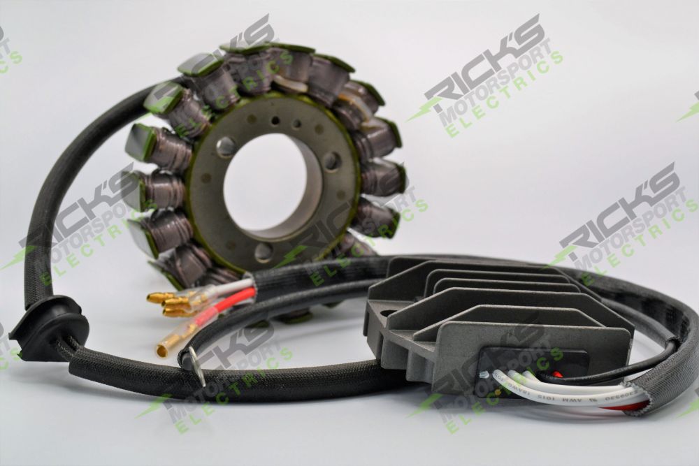 New Hot Shot Kawasaki Charging Kit - this charging kit converts the system from a single phase to a 3 phase system: output power is increased by 50%.? The kit comes with both a new stator & a lith-ion friendly rectifier regulator and customers will reuse their OE flywheel.? Installation instructions included.? This kit will replace OE stator part# 21003-1009 and 21003-1006.? This kit is for permanent magnet systems ONLY, it will NOT work with field excited systems.??*This kit is made for lithium batteries only, NOT for use with standard lead acid batteries*