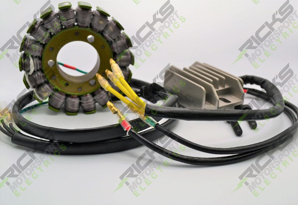 New Hot Shot Kawasaki Charging Kit for use with lithium batteries- this charging kit converts the system from a single phase permanent magnet to a 3 phase permanent magnet system: output power is increased by 50%. The kit comes with both a new stator & lithium compatible rectifier regulator and customers will reuse their OE flywheel. This kit fits 1978-80 KZ650s and replaces stator OE# 21003-1005. Installation instructions included.*This kit is made for lithium batteries only, NOT for use with standard lead acid batteries*