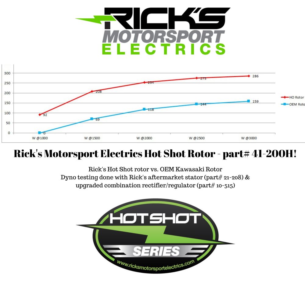 New Hot Shot Kawasaki Rotor; Rick's Motorsport Electrics now manufactures a New Hot Shot Series Rotor for your Vintage Kawasaki Street Bikes with OE# 21007-029, 21007-1004, 21007-1005, and 21007-032. Rick's upgraded rotor design is stronger & more powerful than the OE version and will put out 55% more power!. Check out the graph to compare to the original equipment part.