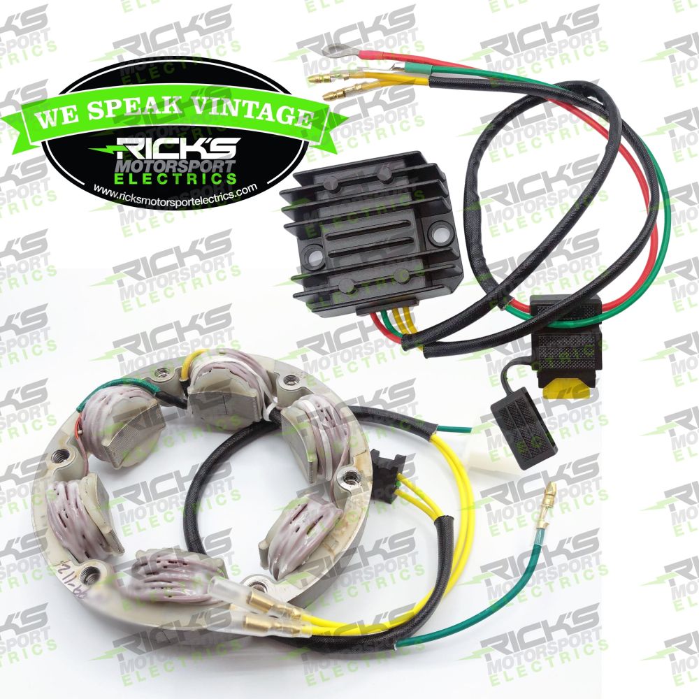 New Honda Charging Kit: This kit is a Rick's Motorsport Electrics original design; it includes both a stator and a rectifier-regulator. The kit will put out approximately 150 watts and power a 55 watt headlight if the customers rotor has not been compromised. To optimize output - upgrade rotor to our part# 41-100H *Lithium Ion battery users: please see our part# 14-99-112 designed specifically for use with lith-ion batteries.